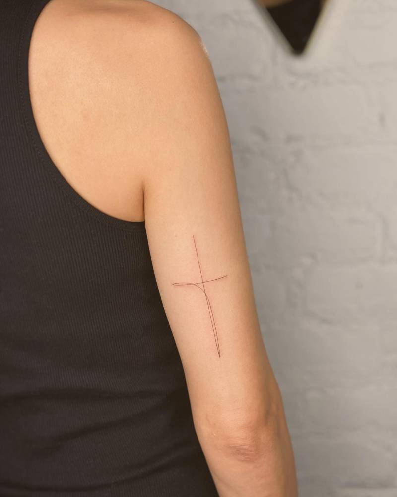 One line cross tattoo in minimalistic style placed on the tricep. Fonte