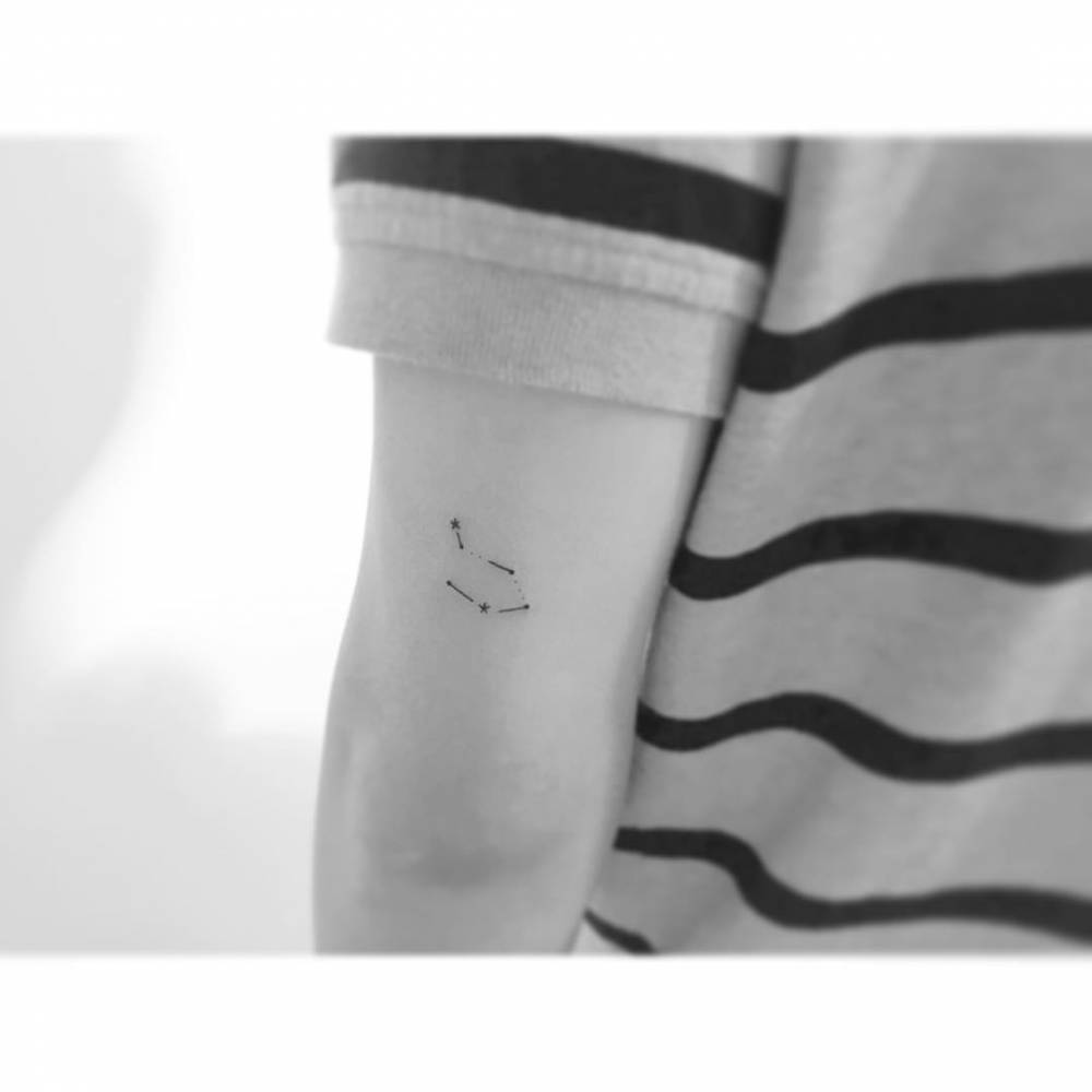 Libra constellation tattoo placed on the tricep, done in minimalistic style. Fonte