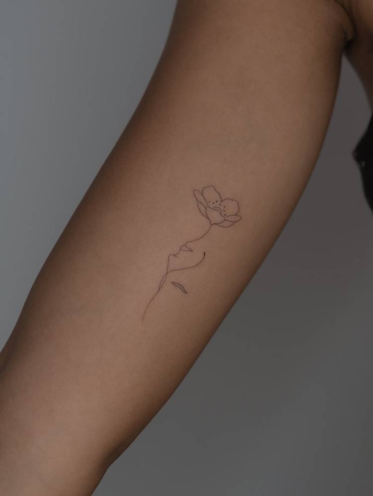 Single needle flower head woman tattoo located on the inner forearm. Fonte