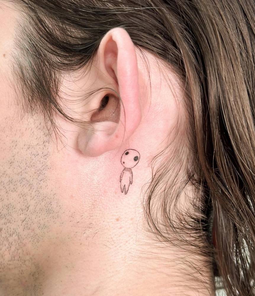 Kodama tattoo in cartoon style located behind the ear. Fonte